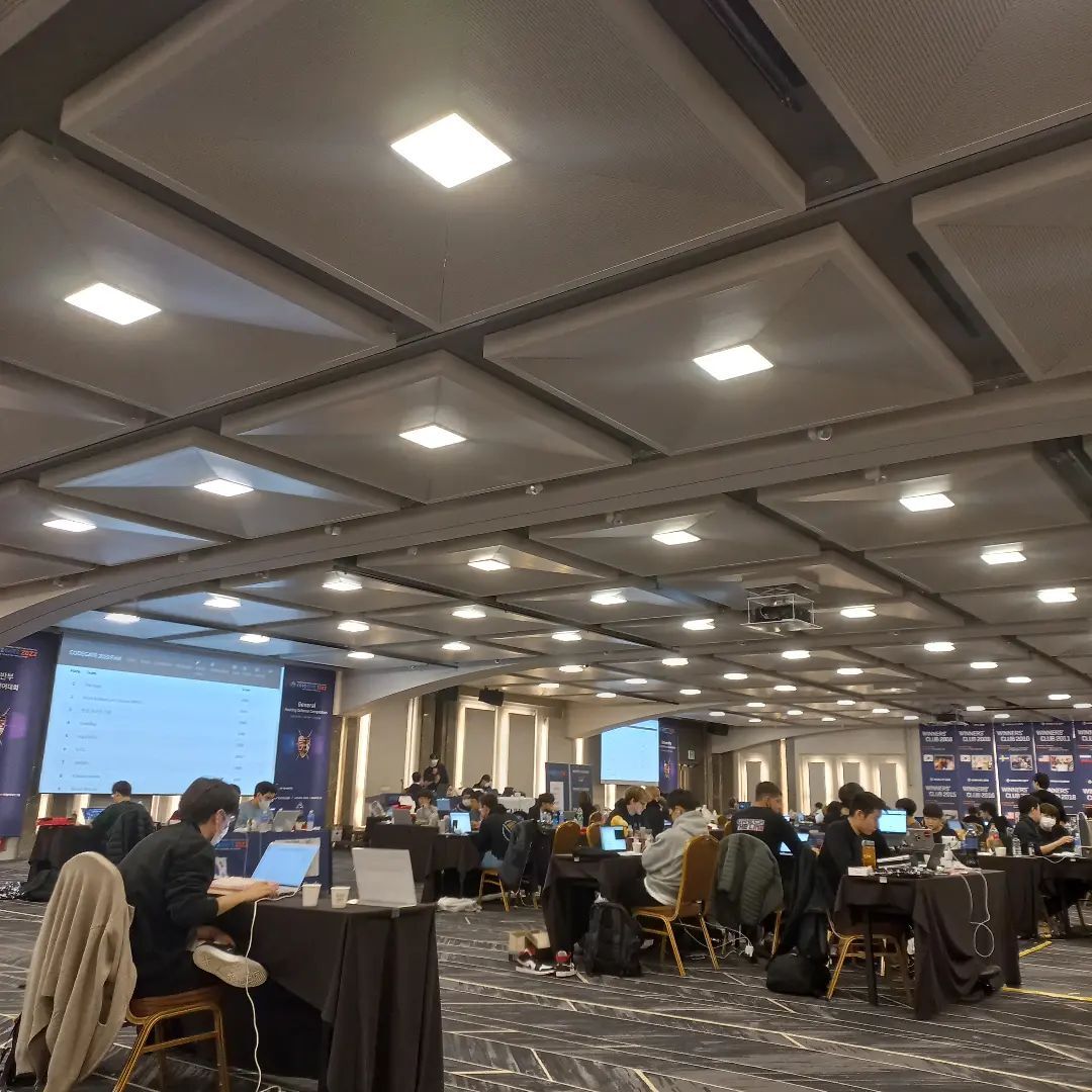 이번 코게는 뭐.. 어차피 1, 2, 3등이 정해져 있어서 딱히 스코어나 순위에 신경쓰지 않고 재밌게 즐겼다. 점수 올리려면 삽질하면 무조건 풀리는 웹을 했어야 했지만 리버싱에 할만해보이는 vm문제가 있길래 삽질하면 충분히 풀 수 있는 웹 2 ~ 3개를 던지고 메이저 대회에서 처음으로 리버싱을 잡아봤다. 덕분에 등수는 10위권에도 못드는 엄청난 나락으로 갔지만 어차피 이번년도에는 수상 못하는 대회라서 미련은 없다. 뭐 즐겜한 대회인 만큼 수상보다는 어떤 재밌는 문제가 나올까에 더 초점을 맞추고 있었어서 전날에도 별로 신경을 안쓴 탓인지 대회장에도 1시간 늦게 가서 사진은 많이 못찍었다.