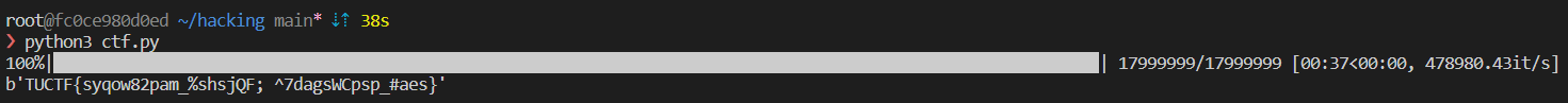 base64 decode까지 하면 위와같이 조금 이상한 플래그같은 문자열이 나온다. 처음에는 저걸 보고 떠오르는 고전암호가 없어서 당황했는데 플래그 포맷이 TUCTF{} 라는 점을 생각해서 자세히 살펴보면 첫번째 문자와 다음 문자가 16byte떨어져있다는 규칙성을 발견할 수 있다. 그리고 그대로 코드를 짜봤는데 TUCT가 무한반복 되었다. 그래서 조금 게싱을 해서 4byte가 지날때마다 16byte가 아니라 17byte떨어진 값을 가져와야겠다는 생각을 했고 그대로 짜니까 정상적으로 플래그가 나왔다.