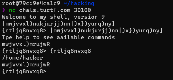 서버에 접속해보면 custom shell을 주는데 각각 문자가 치환되어있는것을 알 수 있다. 치환된걸 입력하면 다시 제대로된 문자열로 해석한다. 그리고 위에 Welcome to my shell, version 9이렇게 shell버전이 있는데 여러번 접속해본 결과 16개의 버전이 있는것같고 각 버전마다 치환되는 문자들이 다르다. help명령어를 치면 각 명령어들의 설명을 볼 수 있는데 cat, ls, cd등의 명령어가 있었다. 치환도 있는데 거기다가 inverse해서 들어가서 그것도 고려해줘야 한다.