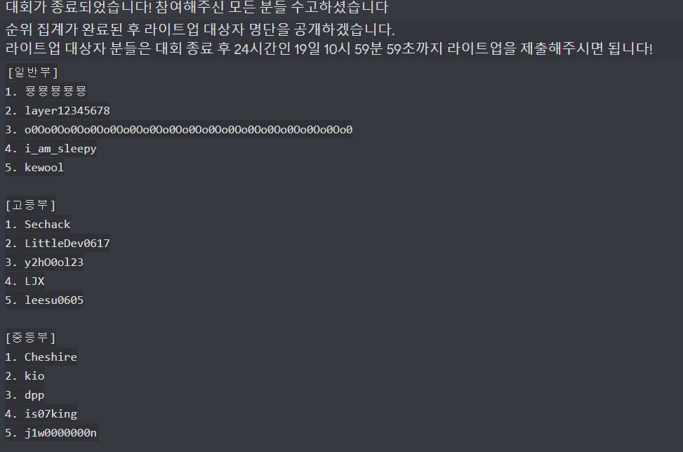 이번 Layer7 CTF는 고등부 1등을 했다. 작년에도 중등부 1등 해서 상받았었는데 연속으로 1등해서 기분이 좋다. 아무거나 한문제만 더풀었으면 위에있는 Ainsetin이라는 사람도 이길 수 있었는데 이건 조금 아쉽긴 하다.