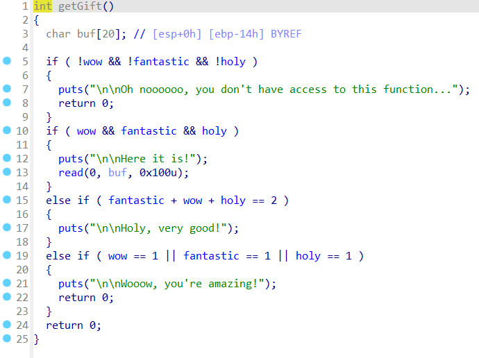바이너리 분석을 해보면 bof를 2군데서 준다. 첫번째 bof는 트리거하려면 조건이 있고 조건 만족하려면 rand함수 값 맞춰야되서 귀찮아진다. 그래서 조건없는 두번째 bof로 그냥 32bit rop하면 된다.
