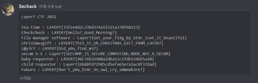 그리고 스코어보드 그래프와 플래그 인증 시간 보면 알겠지만 5문제를 플래그 키핑하고있다가 끝나기 5분전에 싹다 인증해서 순위 급상승 시켰다. 플래그 키핑 한번 해보고 싶었는데 이번에 처음 해봤다. secom S-1은 퍼블 마려워서 키핑 안했고 Checkcheck는 그냥 mic check니까 인증해줬고 baby requester문제를 풀어야 child requester문제가 보인다길래 그냥 푸는김에 같은 시리즈니까 그 두개도 인증해줬다. 나머지는 끝까지 키핑하다가 인증..ㅎㅎ
