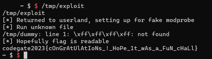 puts("[*] Returned to userland, setting up for fake modprobe");