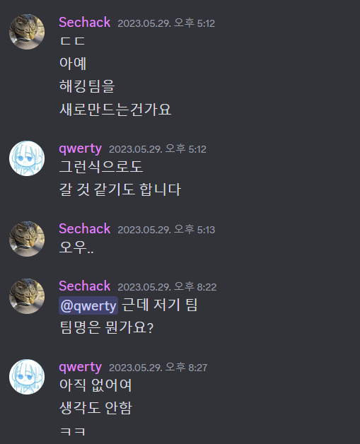 지금 소속되어 있는 CTF팀인 cat :flag_kr: (캣플코라 부른다)이 만들어진 계기다. 저 디코방은 4명이 있는 그냥 친목방이고 거기서 위 사진과 같은 느낌으로 만들어진 팀이다. 그런데 점점 주변 고수들 들어오면서 규모 불어나고 몇번 같이 뛰어봤는데 성과도 웬만한 메이저 팀정도로 엄청 잘나오고 여러모로 메리트 있는 팀이 되었다. 유명하고 규모있는 CTF팀에 합류해서 같이 CTF를 뛰는게 해보고싶던 것 중 하나였는데 캣플코에 합류하게 됨으로써 그걸 이루게 되었다. 그리고 오랫동안 몸담고 있었던 팀이었던 H4C는 중복 팀 방지 룰이 있어서 어쩔 수 없이 나오게 되었다.