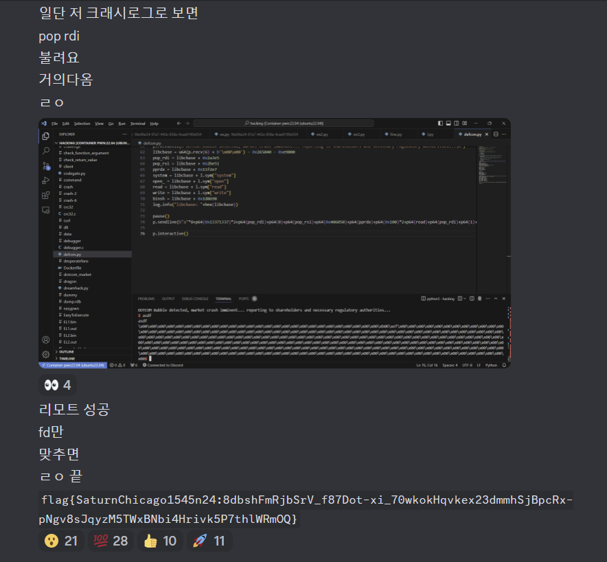 일단 당연히 이런 개고수 팟에서 1인분을 하지는 못했다. 스스로도 1인분 했다고 생각하진 않는다. 하지만 기여한건 분명히 있다. com이라는 포너블 문제 다른분이 rip까지 따고 입력에 NULL 못넣어서 다들 고민하고 있던 와중 내가 아이디어 내고 플래그까지 땄다. 유의미한 기여를 했다. 다른 문제들은 열심히 봤지만 그닥 도움이 되진 못했다.