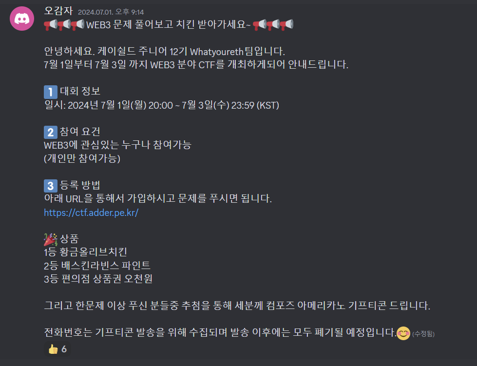등교길에 지하철에서 드림핵 디스코드를 보다가 이런걸 발견했다. 마침 Web3공부를 막 시작한 상태였고 시험기간이라 학교에서도 풀로 자습을 줘서 (자습 아니어도 노트북 하긴 한다) 학교에서 에어팟끼고 노래를 들으며 재밌게 CTF를 했다.