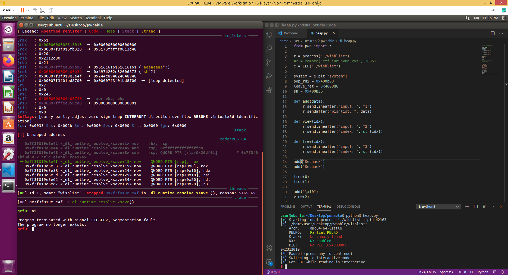 아 그리고 r.recv(4)로 4byte를 받아오기 때문에 heap base주소가 3byte가 되면 뒤에 더미값이 딸려서 주소에 들어가기 때문에 exploit이 안된다. 따라서 3.5byte의 heap base주소가 생성되어야 정상적으로 leak이 되어서 exploit이 가능하다. 뭐 이건 거의 50%확률이니까 터져도 한두번만 다시 실행해보면 따인다.