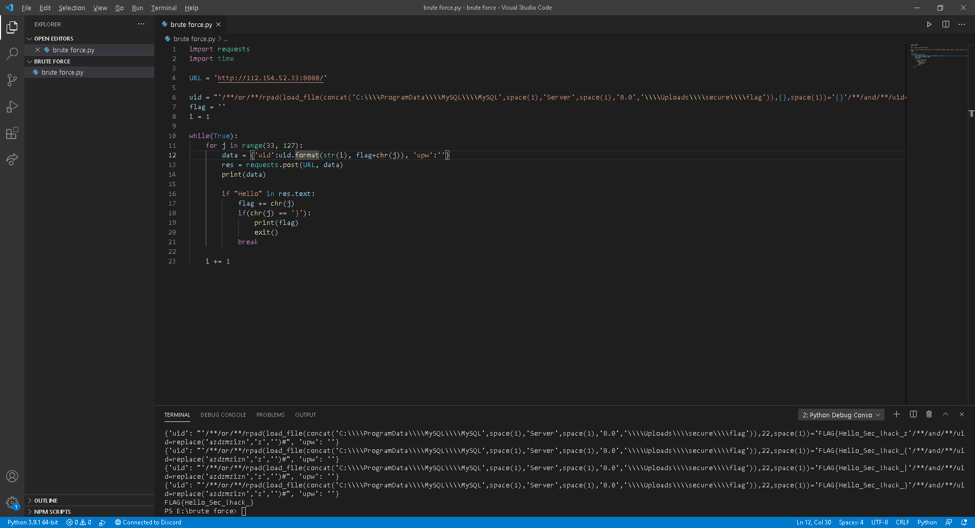 그래서 최종적으로는 이러한 페이로드가 완성된다. 여기서 주의할점이 공백을 필터링하므로 concat함수와 space(1)을 이용해서 공백을 넣어줘야하고 \를 4개 넣어줘야한다. python자체 내에서 이스케이프 처리를 해서 \를 4개넣으면 최종적으로는 \가 2개만 들어가게 되고 mysql에서도 이스케이프 처리를 하기때문에 \를 2개 보내면 최종적으로는 \가 1개가 되면서 정상적으로 경로가 들어가게 된다. 이것때문에 삽질좀 했다... 원래 길이부터 구하는게 정석인데 어차피 플래그 형식이면 }로 끝나므로 그냥 }만나면 종료하게끔 짜줬다.