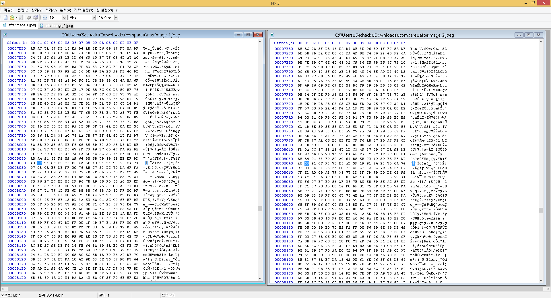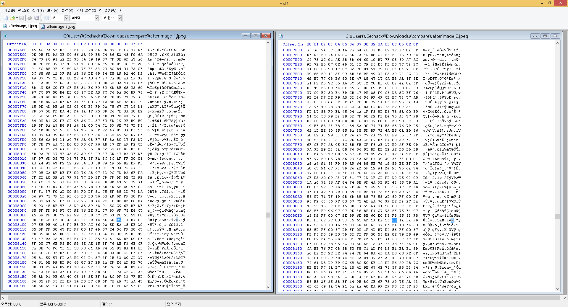 근데 zip파일 이름이 compare였다. 비교하라는것 같다. 그래서 HxD키고 파일 비교 기능을 이용해서 비교해봤다.