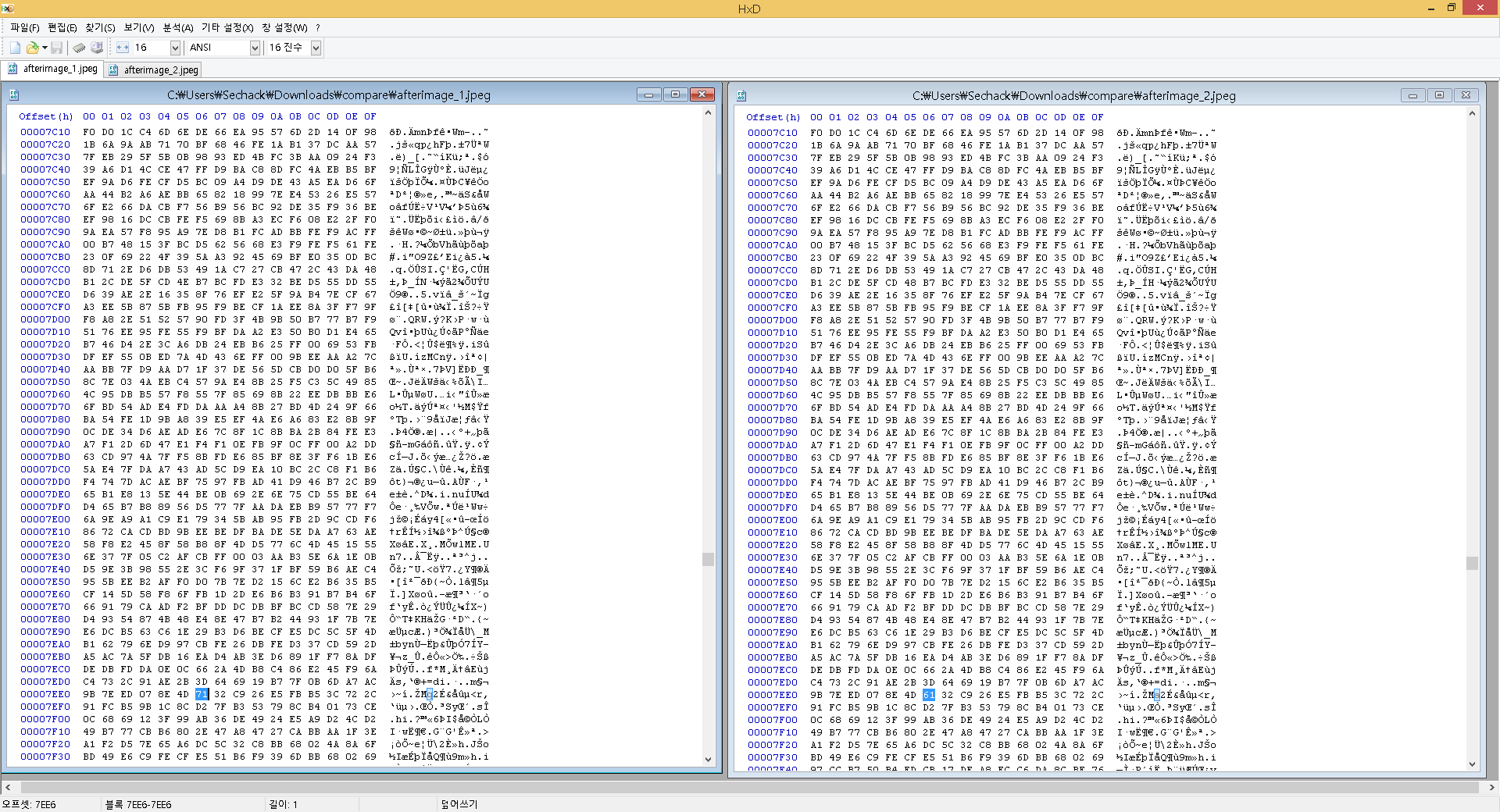 근데 zip파일 이름이 compare였다. 비교하라는것 같다. 그래서 HxD키고 파일 비교 기능을 이용해서 비교해봤다.