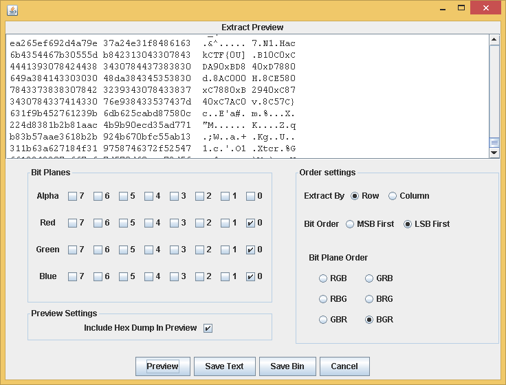이런 사진이 나온다. 저기 밑에 화살표를 눌러서 아무리 이미지를 가공해봐도 전혀 플래그 관련된게 나오지 않는다. 그래서 이미지가 아닌 텍스트로 숨겨져있지 않을까 하고 Analyse -> Extract Preview에 가서 다른 write up대로 옵션 만져주고 Preview누르면 플래그 관련된 값들이 나온다.