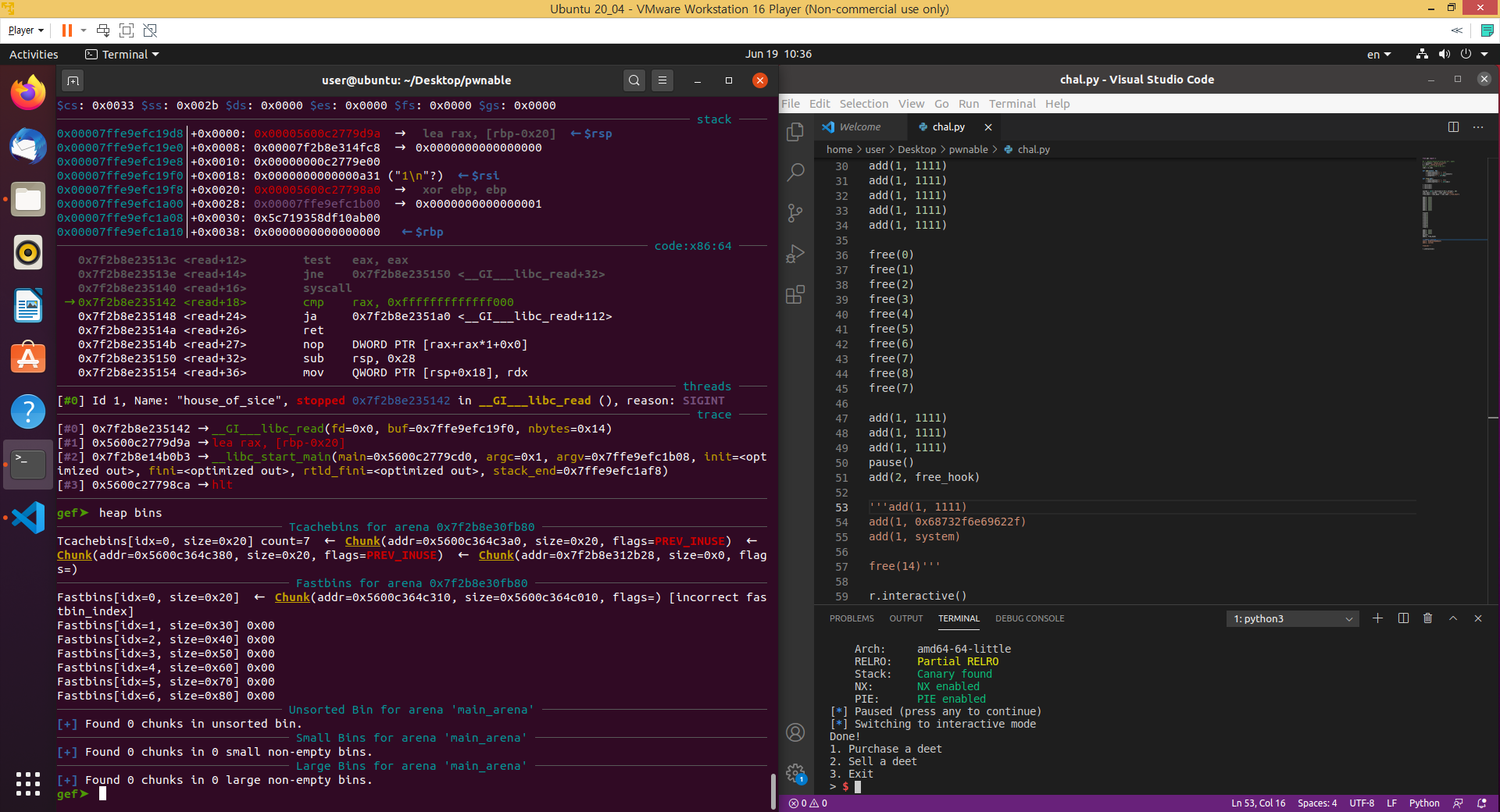 calloc함수에 대해서 배운 문제였다. 풀때 당시에는 원리 모르고 fastbin dfb된 상태에서 calloc로 이것저것 해보다가 tcache가 갑자기 변하길래 뭐지? 하는 마음으로 이것저것 할수있는거 다해보면서 거의 퍼징하듯이 익스했는데 원리를 알고나니까 뿌듯하다.