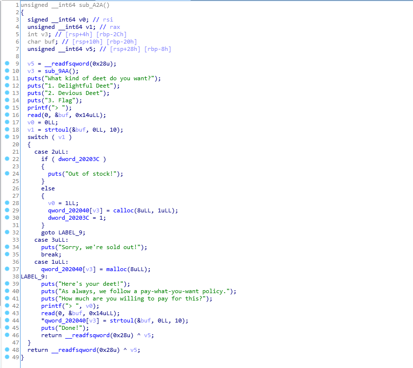 1번을 선택하면 호출되는 함수이다. 일단 여기서도 메뉴가 있는데 1번 메뉴를 사용하면 malloc(8)이 호출되고 2번 메뉴를 사용하면 calloc(8)이 호출된다. 2번 메뉴는 1번만 사용할 수 있다. chunk는 총 16번 할당할 수 있다.