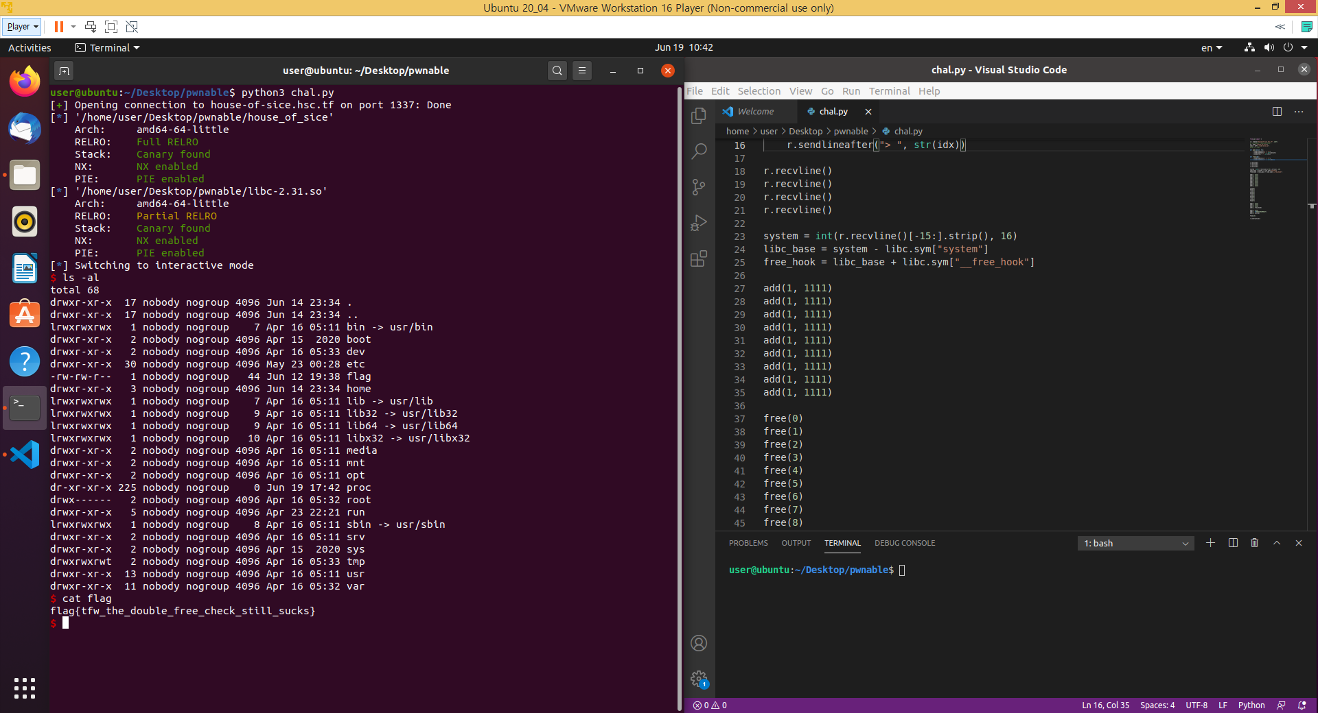 이렇게 되면 free함수가 호출되면서 __free_hook이 호출되고 인자로 /bin/sh가 들어가게 되면서 system("/bin/sh")가 실행되게 된다. 아래는 Full exploit이다.