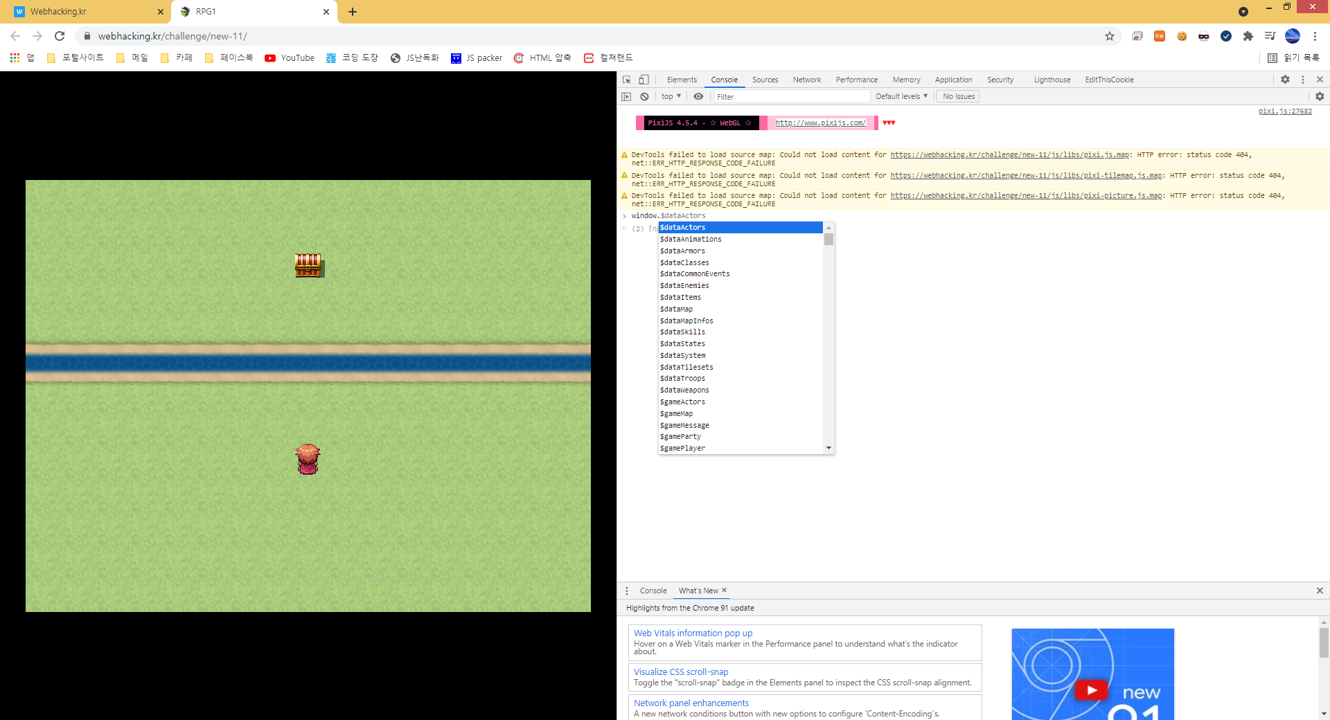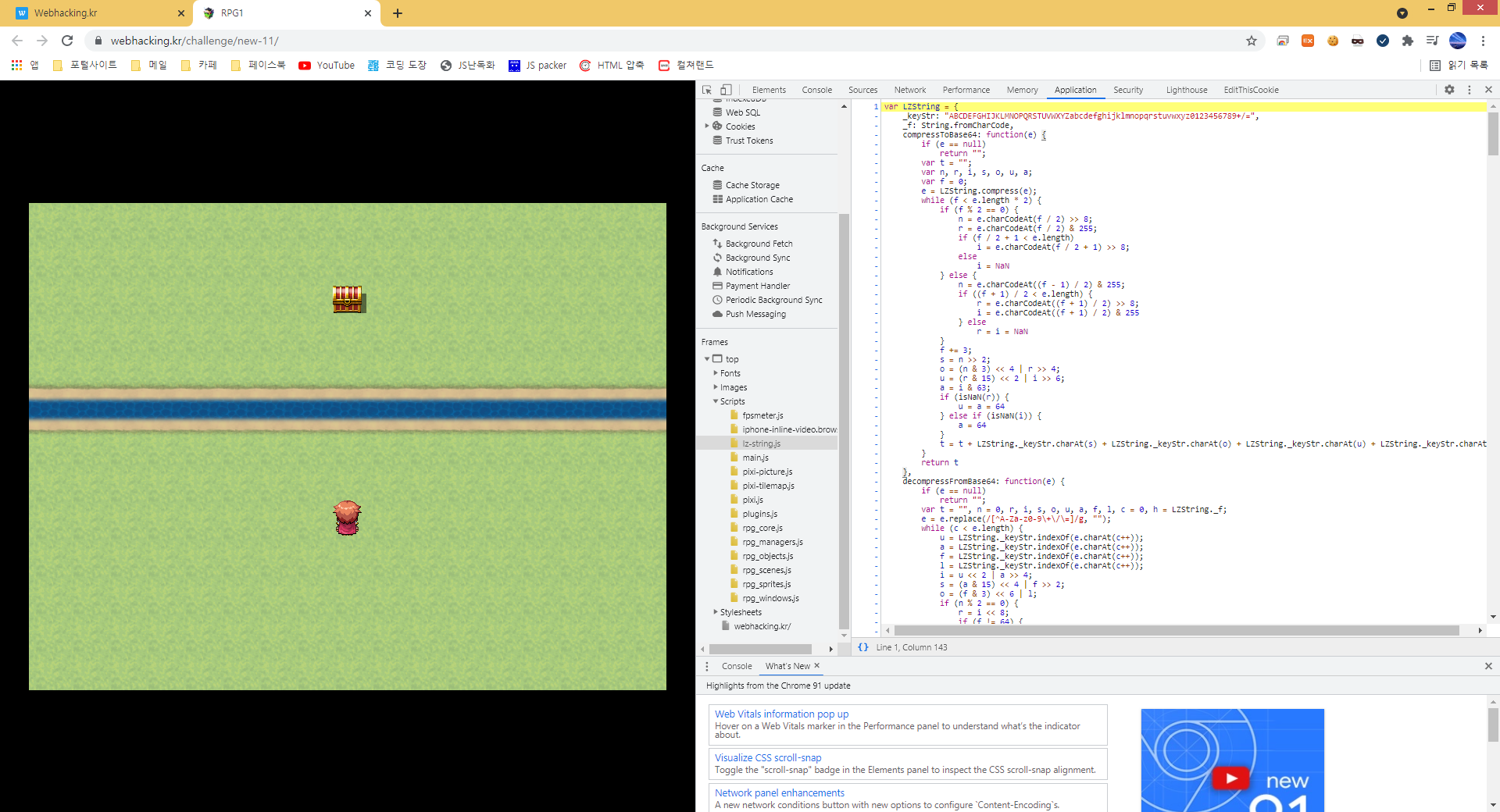 들어가서 new game버튼을 누르면 게임이 나온다. 저기 저 보물상자를 먹어야하는것 같은데 강때문에 막혀있어서 키보드로 백날 조작해봐야 못간다. 절대 못깨게 만들어놓은 게임이다. 하지만 이것은 javascript로 돌아가는 게임이다. 따라서 소스코드를 분석해서 캐릭터의 좌표 위치를 담고있는 무언가를 찾은다음에 변조하면 끝날것이다.