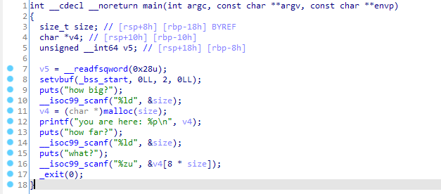 굉장히 심플한 프로그램이다. 하지만 scanf의 서식지정자로 %zu를 줬을때 scanf내부 로직을 모르면 못푸는 문제이다. 일단 libc leak은 대충 1000000정도로 크기 엄청 크게주면 mmap system call로 따로 공간을 할당해서 사용하고 이 영역은 libc와 offset이 일정하다는 특징을 이용해서 libc leak을 할 수가 있다. 그리고 oob가 발생해서 임의의 주소를 한번 덮을 수 있다. libc주소를 얻었으므로 덮을 수 있는곳은 많다. 일단 먼저 나는 문제에서 ld파일도 주길래 rtld overwrite를 시도했다. 하지만 exit가 아니라 _exit함수여서 결국에는 불가능했다. 남은건 vtable쪽 함수포인터 건드리거나 hook밖에 없는데 vtable은 현실적으로 불가능할것 같아서 hook위주로 삽질해봤다. 일단 scanf내부 로직을 파악해봤다.