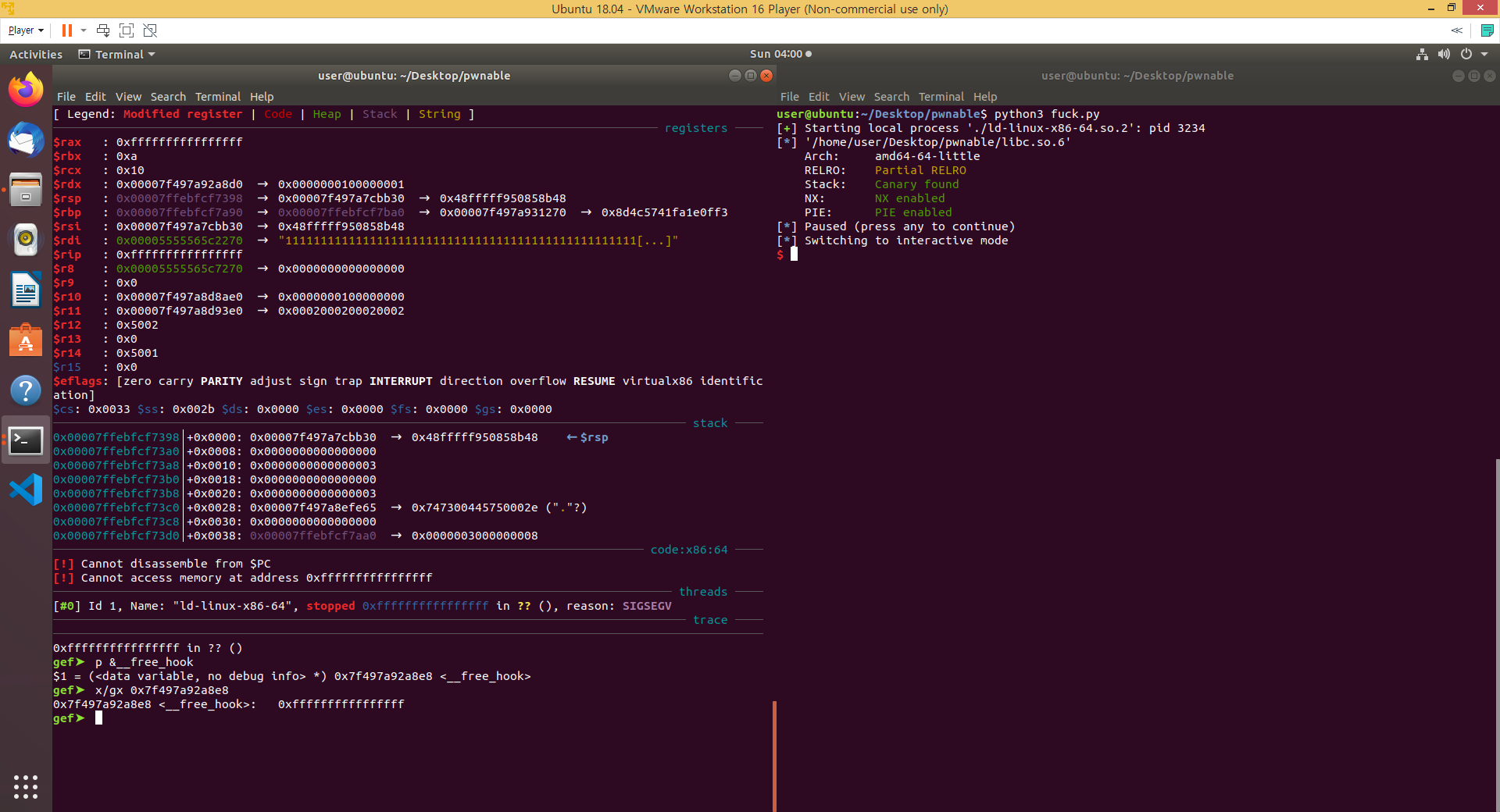 Segmentation fault가 난다... free hook은 의도한대로 덮인거였다...ㅋㅋ 근데 로컬에서 원가젯 3개를 다 넣어봐도 안되는것이다... libc버전이 2.28인데 2.28버전에서는 내 경험상 one_gadget툴로 찾은 원가젯중에 하나는 먹힌다. 그래서 한번 remote로도 해봤는데 2번째 원가젯과 3번째 원가젯이 동작해서 셸이 따였다. 로안리되 인것이다...ㅋㅋ 아마 내생각에는 ld파일까지 같이 로드시킨다고
