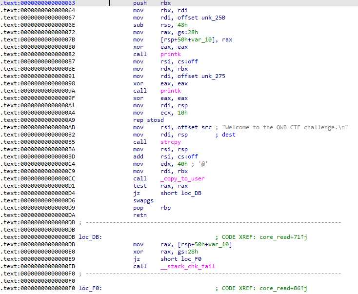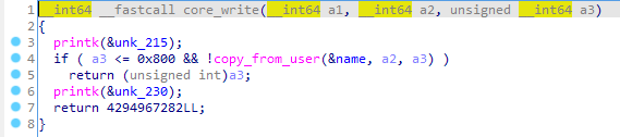 앞서 봤던 fops에 등록되었던 함수중에 core_write라는 함수가 있었다. 다행히도 이녀셕이 copy_from_user함수를 이용해서 0x800크기 이하의 길이 한정해서 name전역변수로 우리가 전달한 버퍼의 값을 복사해준다. 0x800은 rip를 덮고도 한참 남는 크기니까 신경 안써도 된다.