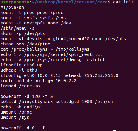 그 이유는 아까 cpio.ko와 같은 디렉터리에 있는 init파일을 보면 알 수 있다. kadr로 인해서 현재 커널 함수들의 주소를 저장하고 있는 /proc/kallsyms는 root사용자만 읽을 수 있다. root가 아닌 사용자가 읽으려고 시도하면 모든 주소가 0으로 표시되면서 별다른 소득을 얻지 못한다. 하지만 init파일을 보면 cat /proc/kallsyms > /tmp/kallsyms 이런 문장이 보인다. /proc/kallsyms는 읽을 권한이 없지만 /tmp/kallsyms는 읽을 수 있다. /tmp/kallsyms에는 /proc/kallsyms의 내용들이 그대로 복사되니까 우리는 /tmp/kallsyms파일을 읽음으로써 leak을 할 수 있게 된다. 이제 leak까지 해결되었으니까 앞에서 짜본 시나리오를 바탕으로 익스플로잇을 제작해보자.