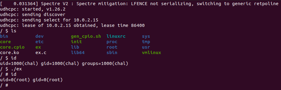 우리는 core디렉터리에서 작업한거고 처음에 core.cpio를 압축해제해서 core.ko파일을 추출해냈었다. 이제는 core.cpio파일에 우리가 작성한 익스플로잇을 포함시켜서 압축한다음 사용하면 된다. 그리고 gcc로 컴파일할때 반드시 static옵션을 붙여줘야 한다. 그 이유는 커널에서 동적 링커를 찾지 못해서 익스플로잇이 실행되지 않을 수 있기 때문이다.