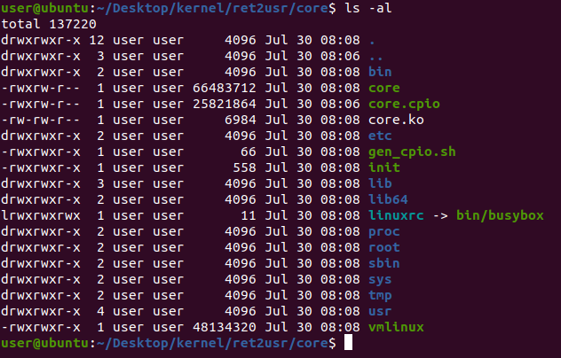 압축을 풀어보면 4개의 파일이 있다. bzImage파일은 압축된 커널 이미지 파일이다. 부팅시에 사용한다. core.cpio파일은 file system을 압축시켜놓은 파일로 압축을 해제해보면 우리가 분석하고자 하는 모듈(ko파일)을 얻을 수 있다. 이 ko파일을 IDA와 같은 디버거로 분석해보면서 해당 모듈의 취약점을 찾고 익스플로잇을 작성할 수 있다.
