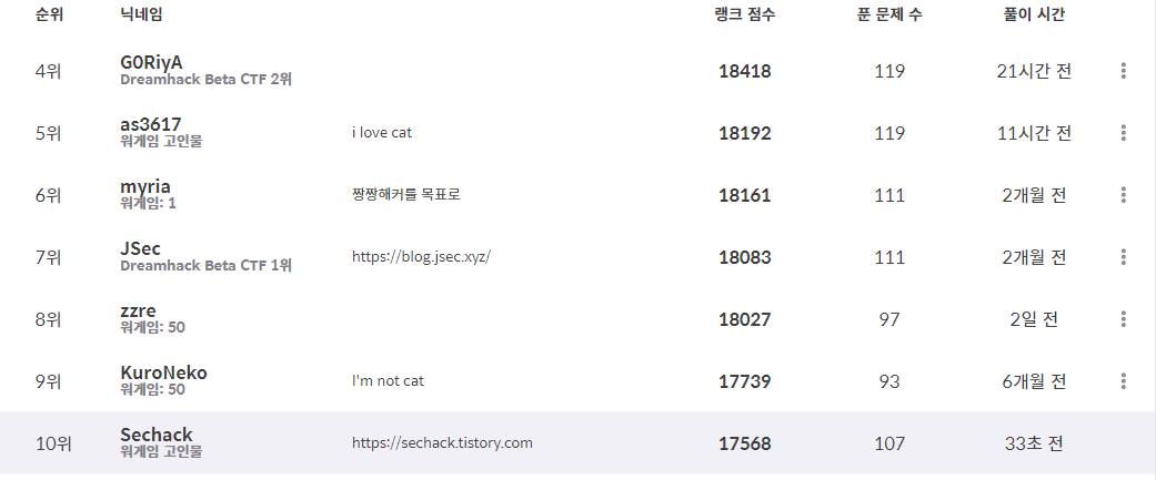 보이다시피 top10을 찍었다. 드림핵에는 회원등급, 워게임, CTF 이렇게 총 3가지의 순위가 있는데 그중 워게임이 top10안에 들었다. 매우 기분이 좋다. 회원등급은 열심히 활동해서 그런지 그다지 관심 두지 않았는데도 경험치가 쭉쭉 올라서 4등이다. CTF순위는... 음... 91등... 처참하다... 거의 백지시절일때 Dreamhack CTF몇번 참가해서 한문제도 못풀고 점수 깎였는데... 지금보면 쉬운문제도 되게 많다...ㅎㅎ... 아무튼 언제 순위가 바뀔지는 모르겠지만 지금은 top10!!