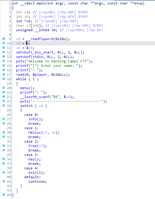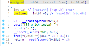 Free함수는 선택한 인덱스에 있는 청크를 해제하는데 초기화를 하지 않아서 DFB가 터진다. 여기서 glibc파일을 주지 않기 때문에 glibc버전을 알 수 없는데 간단한 꿀팁이 있다. free(0); free(0); 이런식으로 해제했을때 정상적으로 해제되면 ubuntu 18.04일 확률이 높고 같은 청크를 연달아 해제하면 안되지만 free(0); free(1); free(0)이 된다면 ubuntu 16.04일 확률이 높고 둘다 안된다면 ubuntu 20.04이상의 버전일 확률이 높다. 나는 위와같은 테스트를 통해서 ubuntu 16.04에서 fastbin dfb가 터지는 환경이라고 결론지었다.