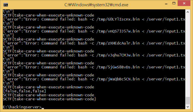 사이트에도 명시되어있듯이 gcc를 사용해서 컴파일을 한 뒤 바이너리를 실행한다. 그렇기 때문에 일부러 문법 오류를 내면 gcc로 컴파일할때 에러난게 그대로 팝업창으로 뜬다. 아무튼 컴파일 시간과 바이너리 실행하는 시간이 합해져서 그런지 brute force가 매우 오래걸렸다. 처음에는 속도보고 thread를 쓰려고 했지만 10개만 생성해도 응답을 못받아오길래 그냥 thread안쓰고 매우 오랜시간 기다려서 플래그를 얻었다.