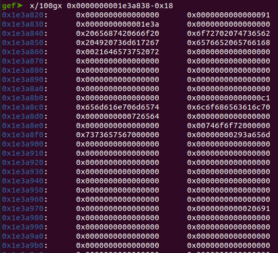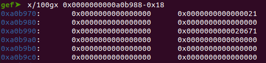 먼저 이 바이너리는 static linker로 컴파일 되어있다. 따라서 glibc기준으로 동작하는 gef의 heap chunks, heap bins와 같은 힙 디버깅에 유용한 꽤 강력한 명령어들을 사용하지 못한다. 따라서 힙 메모리를 사용하는 부분에 bp를 걸고 직접 x/gx로 메모리를 보는수밖에 없다. 먼저 length를 1로 줘보면