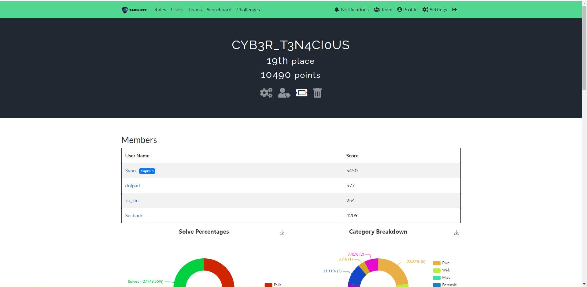 이번엔 민욱이형이랑 같이 TeamH4C CTF팀이 아닌 다른 CTF팀으로 참여했다. 평일에 하는거여서 시간이 약간 부족한감이 있었는데 포너블 올클도 하고 나름대로 만족스러웠다. 최종 결과는 19등이다. 버스탔다. ㅋㅋ Syno계정은 지용님이랑 민욱이형이 같이쓴 계정이다. 아무튼 쌉캐리..
