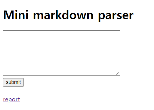report기능이 있는걸 보니 xss, csrf와 같은 Client에서 일어나는 취약점인것 같습니다. 쿠키 탈취가 목적인 문제라고 생각해볼 수 있습니다. 마크다운 파서라는데 아무거나 입력하고 submit을 눌러보면 파일을 볼 수 있는 view.php가 있음을 알 수 있는데 Easy Web문제와 같이 LFI가 터집니다.