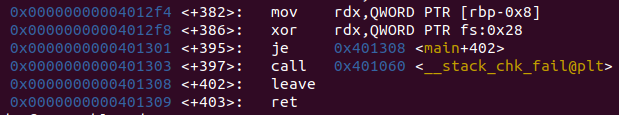 그리고 에필로그 부분에서는 rbp-0x8의 값과 fs:0x28의 값을 비교해서 같을 경우에만 정상적으로 리턴하고 다를 경우에는 __stack__chk_fail함수를 호출해서 프로그램을 종료시키는것을 볼 수 있습니다.