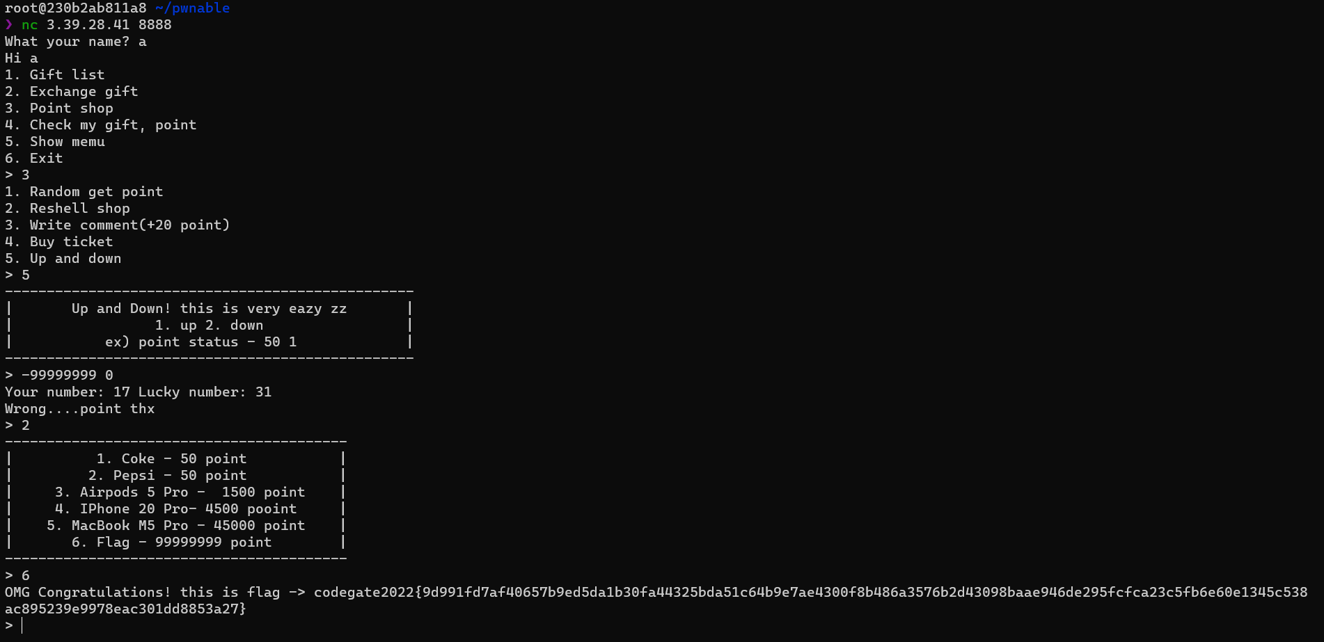 nc만 주길래 접속해봤더니 up-down게임이라고 뜹니다. 1부터 1000000000000까지의 숫자중에 프로그램이 생성한 숫자를 up-down게임으로 맞추면 되는데 제한시간이 5초입니다. 따라서 up-down게임을 하는데 가장 효율적인 Binary search algorithm을 사용해서 풀면 됩니다. 한번이 아니라 여러번 하길래 2중 반복문 돌렸습니다.