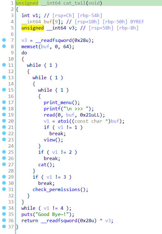 다시 취약한 부분으로 돌아와 보면 우리가 입력한 정수가 v5변수로 들어가는데 v5변수는 int형입니다. 따라서 음수 입력이 가능하고 v5가 2보다 작을 경우에 setNameg함수로 v7[v5 - 1]을 넘겨주고 이말은 즉 v7변수의 주소보다 작은 주소에 저장되어 있는 주소를 아무거나 가져와서 입력할 수 있다는 것이다. 0을 입력하면 v7[-1]이 되게 되는데 이때 0x1000byte를 꽉채워서 입력 보냈을때 bof가 터졌습니다. canary가 있지만 thread stack이기 때문에 master canary가 저장되어있는 TLS영역과 인접한 주소에 있습니다. 따라서 0x1000byte를 꽉채워서 입력을 보내게 되면 master canary가 덮이기 때문에 canary를 bypass할 수 있습니다.