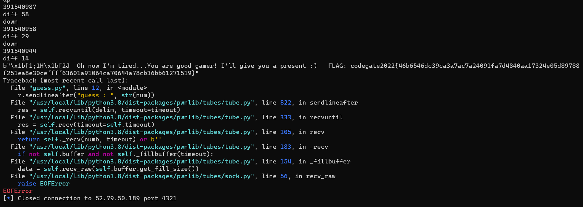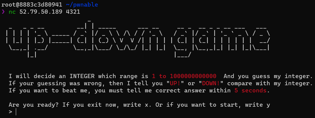 nc만 주길래 접속해봤더니 up-down게임이라고 뜹니다. 1부터 1000000000000까지의 숫자중에 프로그램이 생성한 숫자를 up-down게임으로 맞추면 되는데 제한시간이 5초입니다. 따라서 up-down게임을 하는데 가장 효율적인 Binary search algorithm을 사용해서 풀면 됩니다. 한번이 아니라 여러번 하길래 2중 반복문 돌렸습니다.