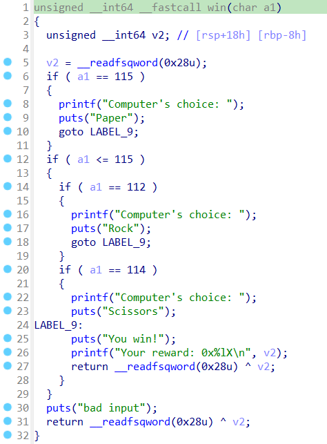이겼다 하고 카나리 값 준다. if문이 있긴 한데 어차피 전부 카나리 값 주는 곳으로 점프뛰는 구조여서 딱히 신경 안써도 된다. 따라서 이길때까지 가위바위보를 하면 카나리를 얻을 수 있다.