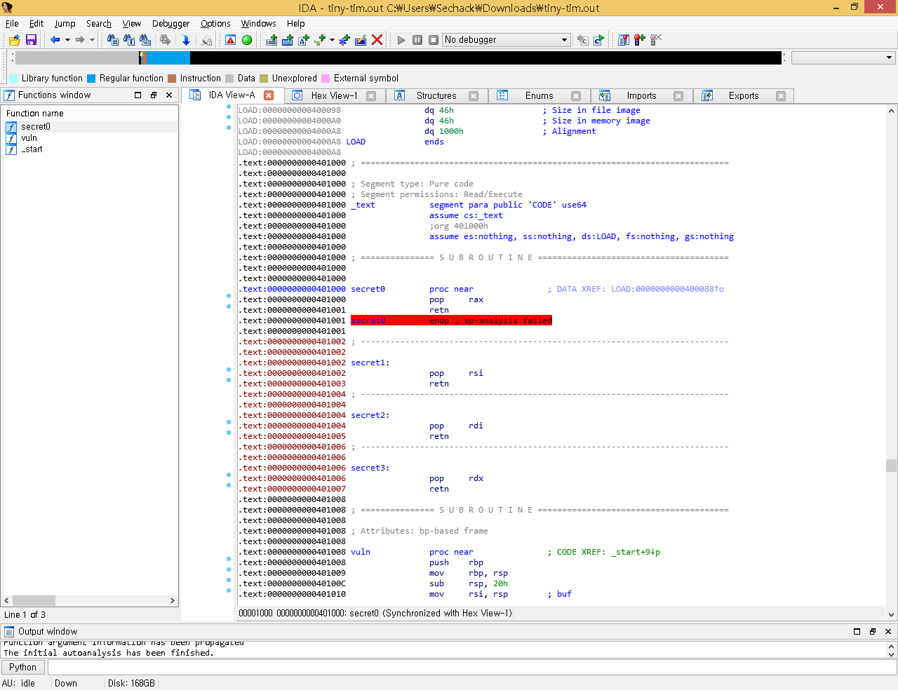 바이너리가 굉장히 심플합니다. nasm으로 구현된것 같네요. vuln함수를 보면 rsp에 입력을 받으니까 ret를 조작할 수 있습니다.