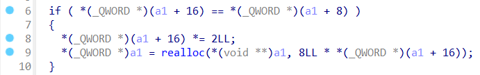 length와 size모두 0이니까 if문에 걸리게 되고 0*2 = 0이니까 realloc의 인자로 첫번째, 두번째 모두 0이 전달된다. 이럴 경우에는 realloc은 0x20크기의 청크를 새로 할당받아서 반환해준다. 따라서 0x20짜리 청크가 새로운 큐가 되는것이다. 근데 length가 0인 상태로 if문이 끝나버리고 push를 하면서 size는 1이 되게 된다. 그리고 또 queue_push를 호출하면..? length는 0인데 size는 1이니까 둘이 달라서 if문은 호출되지 않는다. 그리고 데이터가 또 push되서 size는 2가 된다. 이걸 반복하면..? length와 size가 같을일은 pop을 하지 않는이상 절대 없어서 if문은 절대 호출되지 않는다. 이말은 즉 큐가 꽉차도 더 큰 큐를 할당하는 과정인 realloc을 해주지 않아서 다른 청크를 침범해서 push를 하게 된다. heap overflow가 발생하는 것이다.