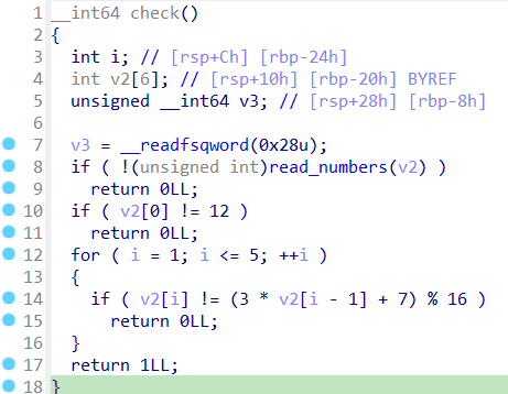 그냥 숫자 6개 입력받고 조건 만족하는지 체크해서 맞으면 플래그 준다. 비교하는 값을 앞에 숫자에 특정 연산을 해서 설정하는데 첫번째 값은 12로 고정이다. 첫번째 값을 아니까 for문 안에서 하는 연산 그대로 반복해줘서 6개의 숫자 모두 알아낼 수 있다.
