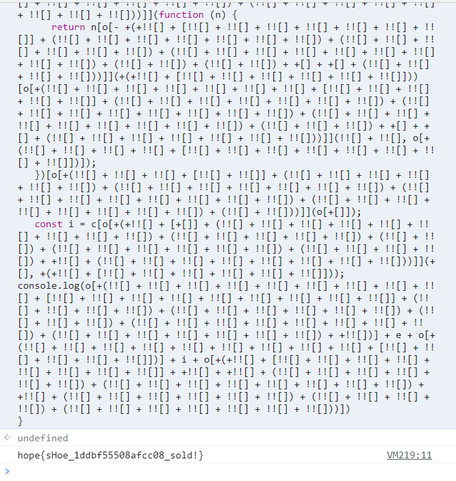 <input id="input"></input><button onclick="check()">check solve</button><script> function check() { checkSolve(document.getElementById('input').value); } async function checkSolve(n) { const o = JSON.parse( '{"0":"","48":"0","95":"_","107332":"log","107868":"map","3151786":"from","3267882":"join","3344077":"mark","3373707":"name","92960979":"angle","99463871":"hope{","109526418":"slice","400256961":"you got it!","757893007":"padStart","1207387375":"wrong flag :(","1811681647":"_sold!}","-1074417128":"[object Object]","-1523887726":"SHA-256","-989967315":"fromCharCode","-1106363674":"length","-1776922004":"toString","-1266514778":"frames","-1013175693":"onLine","-1439500848":"orientation","-1298776554":"encode","-1331913276":"digest","-891528531":"subtle"}' ); const e = String[ o[ -+( !![] + !![] + !![] + !![] + !![] + !![] + !![] + !![] + !![] + [!![] + !![] + !![] + !![] + !![] + !![] + !![] + !![]] + (!![] + !![] + !![] + !![] + !![] + !![] + !![] + !![] + !![]) + (!![] + !![] + !![] + !![] + !![] + !![] + !![] + !![] + !![]) + (!![] + !![] + !![] + !![] + !![] + !![]) + (!![] + !![] + !![] + !![] + !![] + !![] + !![]) + (!![] + !![] + !![]) + +!![] + (!![] + !![] + !![] + !![] + !![]) ) ] ]( +( +!![] + [!![] + !![] + !![] + !![]] + (!![] + !![] + !![] + !![] + !![] + !![] + !![] + !![]) ) - eval[ o[ -+( +!![] + [!![] + !![] + !![] + !![] + !![] + !![] + !![]] + (!![] + !![] + !![] + !![] + !![] + !![] + !![]) + (!![] + !![] + !![] + !![] + !![] + !![]) + (!![] + !![] + !![] + !![] + !![] + !![] + !![] + !![] + !![]) + (!![] + !![]) + (!![] + !![]) + +[] + +[] + (!![] + !![] + !![] + !![]) ) ] ]()[ o[ -+( +!![] + [+!![]] + +[] + (!![] + !![] + !![] + !![] + !![] + !![]) + (!![] + !![] + !![]) + (!![] + !![] + !![] + !![] + !![] + !![]) + (!![] + !![] + !![]) + (!![] + !![] + !![] + !![] + !![] + !![]) + (!![] + !![] + !![] + !![] + !![] + !![] + !![]) + (!![] + !![] + !![] + !![]) ) ] ] ) + String[ o[ -+( !![] + !![] + !![] + !![] + !![] + !![] + !![] + !![] + !![] + [!![] + !![] + !![] + !![] + !![] + !![] + !![] + !![]] + (!![] + !![] + !![] + !![] + !![] + !![] + !![] + !![] + !![]) + (!![] + !![] + !![] + !![] + !![] + !![] + !![] + !![] + !![]) + (!![] + !![] + !![] + !![] + !![] + !![]) + (!![] + !![] + !![] + !![] + !![] + !![] + !![]) + (!![] + !![] + !![]) + +!![] + (!![] + !![] + !![] + !![] + !![]) ) ] ]( (window.frames[ o[ -+( +!![] + [+!![]] + +[] + (!![] + !![] + !![] + !![] + !![] + !![]) + (!![] + !![] + !![]) + (!![] + !![] + !![] + !![] + !![] + !![]) + (!![] + !![] + !![]) + (!![] + !![] + !![] + !![] + !![] + !![]) + (!![] + !![] + !![] + !![] + !![] + !![] + !![]) + (!![] + !![] + !![] + !![]) ) ] ] !== -+!![]) * +(!![] + !![] + !![] + !![] + !![] + !![] + !![] + [!![] + !![]]) ) + String[ o[ -+( !![] + !![] + !![] + !![] + !![] + !![] + !![] + !![] + !![] + [!![] + !![] + !![] + !![] + !![] + !![] + !![] + !![]] + (!![] + !![] + !![] + !![] + !![] + !![] + !![] + !![] + !![]) + (!![] + !![] + !![] + !![] + !![] + !![] + !![] + !![] + !![]) + (!![] + !![] + !![] + !![] + !![] + !![]) + (!![] + !![] + !![] + !![] + !![] + !![] + !![]) + (!![] + !![] + !![]) + +!![] + (!![] + !![] + !![] + !![] + !![]) ) ] ]( (navigator[ o[ -+( +!![] + [+[]] + +!![] + (!![] + !![] + !![]) + +!![] + (!![] + !![] + !![] + !![] + !![] + !![] + !![]) + (!![] + !![] + !![] + !![] + !![]) + (!![] + !![] + !![] + !![] + !![] + !![]) + (!![] + !![] + !![] + !![] + !![] + !![] + !![] + !![] + !![]) + (!![] + !![] + !![]) ) ] ] + screen.orientation[ o[ +( !![] + !![] + !![] + !![] + !![] + !![] + !![] + !![] + !![] + [!![] + !![]] + (!![] + !![] + !![] + !![] + !![] + !![] + !![] + !![] + !![]) + (!![] + !![] + !![] + !![] + !![] + !![]) + +[] + (!![] + !![] + !![] + !![] + !![] + !![] + !![] + !![] + !![]) + (!![] + !![] + !![] + !![] + !![] + !![] + !![]) + (!![] + !![] + !![] + !![] + !![] + !![] + !![] + !![] + !![]) ) ] ]) * +(+!![] + [+!![]] + +!![]) ) + String[ o[ -+( !![] + !![] + !![] + !![] + !![] + !![] + !![] + !![] + !![] + [!![] + !![] + !![] + !![] + !![] + !![] + !![] + !![]] + (!![] + !![] + !![] + !![] + !![] + !![] + !![] + !![] + !![]) + (!![] + !![] + !![] + !![] + !![] + !![] + !![] + !![] + !![]) + (!![] + !![] + !![] + !![] + !![] + !![]) + (!![] + !![] + !![] + !![] + !![] + !![] + !![]) + (!![] + !![] + !![]) + +!![] + (!![] + !![] + !![] + !![] + !![]) ) ] ]( (performance[ o[ +( !![] + !![] + !![] + [!![] + !![] + !![]] + (!![] + !![] + !![] + !![]) + (!![] + !![] + !![] + !![]) + +[] + (!![] + !![] + !![] + !![] + !![] + !![] + !![]) + (!![] + !![] + !![] + !![] + !![] + !![] + !![]) ) ] ]({})[ o[ +( !![] + !![] + !![] + [!![] + !![] + !![]] + (!![] + !![] + !![] + !![] + !![] + !![] + !![]) + (!![] + !![] + !![]) + (!![] + !![] + !![] + !![] + !![] + !![] + !![]) + +[] + (!![] + !![] + !![] + !![] + !![] + !![] + !![]) ) ] ] === o[ -+( +!![] + [+[]] + (!![] + !![] + !![] + !![] + !![] + !![] + !![]) + (!![] + !![] + !![] + !![]) + (!![] + !![] + !![] + !![]) + +!![] + (!![] + !![] + !![] + !![] + !![] + !![] + !![]) + +!![] + (!![] + !![]) + (!![] + !![] + !![] + !![] + !![] + !![] + !![] + !![]) ) ]) * +(+!![] + [+[]] + +!![]) ); const t = new TextEncoder()[ o[ -+( +!![] + [!![] + !![]] + (!![] + !![] + !![] + !![] + !![] + !![] + !![] + !![] + !![]) + (!![] + !![] + !![] + !![] + !![] + !![] + !![] + !![]) + (!![] + !![] + !![] + !![] + !![] + !![] + !![]) + (!![] + !![] + !![] + !![] + !![] + !![] + !![]) + (!![] + !![] + !![] + !![] + !![] + !![]) + (!![] + !![] + !![] + !![] + !![]) + (!![] + !![] + !![] + !![] + !![]) + (!![] + !![] + !![] + !![]) ) ] ](e); const r = await crypto.subtle[ o[ -+( +!![] + [!![] + !![] + !![]] + (!![] + !![] + !![]) + +!![] + (!![] + !![] + !![] + !![] + !![] + !![] + !![] + !![] + !![]) + +!![] + (!![] + !![] + !![]) + (!![] + !![]) + (!![] + !![] + !![] + !![] + !![] + !![] + !![]) + (!![] + !![] + !![] + !![] + !![] + !![]) ) ] ]( o[ -+( +!![] + [!![] + !![] + !![] + !![] + !![]] + (!![] + !![]) + (!![] + !![] + !![]) + (!![] 