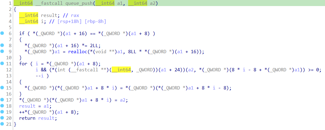 length와 size모두 0이니까 if문에 걸리게 되고 0*2 = 0이니까 realloc의 인자로 첫번째, 두번째 모두 0이 전달된다. 이럴 경우에는 realloc은 0x20크기의 청크를 새로 할당받아서 반환해준다. 따라서 0x20짜리 청크가 새로운 큐가 되는것이다. 근데 length가 0인 상태로 if문이 끝나버리고 push를 하면서 size는 1이 되게 된다. 그리고 또 queue_push를 호출하면..? length는 0인데 size는 1이니까 둘이 달라서 if문은 호출되지 않는다. 그리고 데이터가 또 push되서 size는 2가 된다. 이걸 반복하면..? length와 size가 같을일은 pop을 하지 않는이상 절대 없어서 if문은 절대 호출되지 않는다. 이말은 즉 큐가 꽉차도 더 큰 큐를 할당하는 과정인 realloc을 해주지 않아서 다른 청크를 침범해서 push를 하게 된다. heap overflow가 발생하는 것이다.