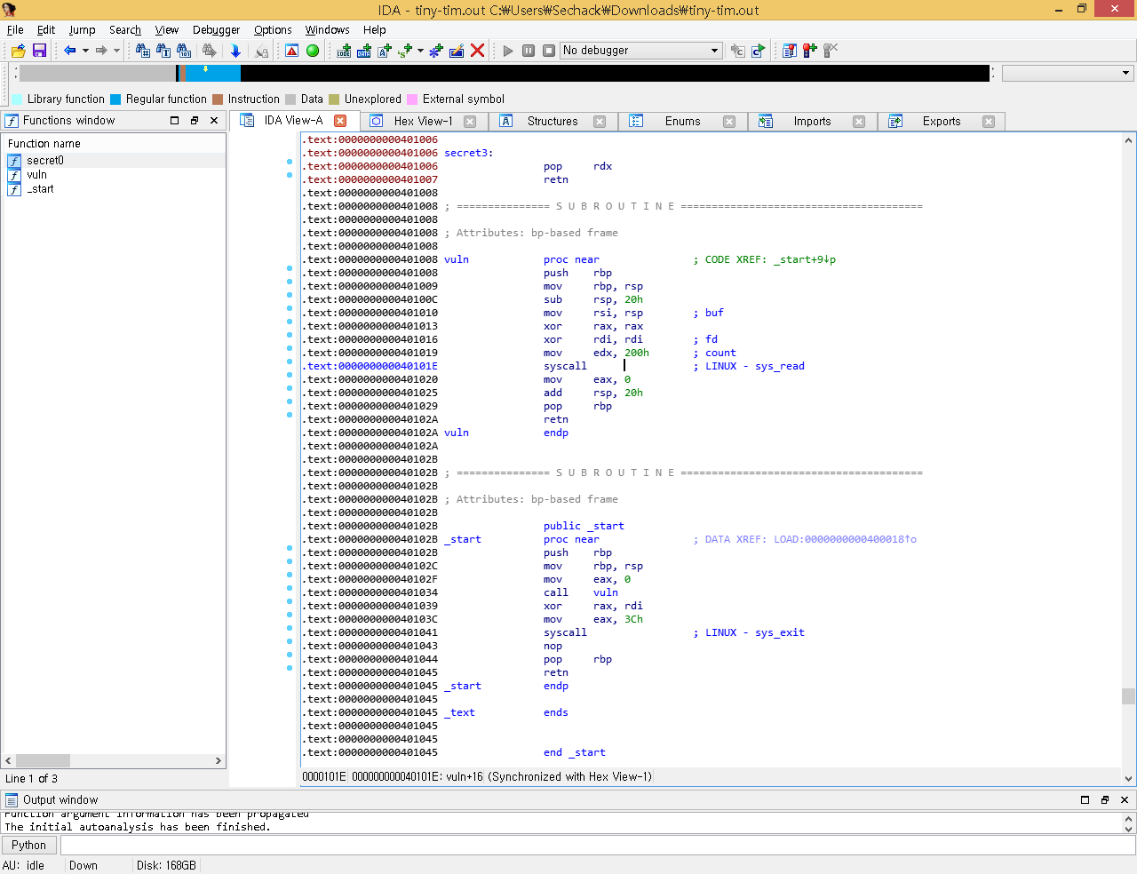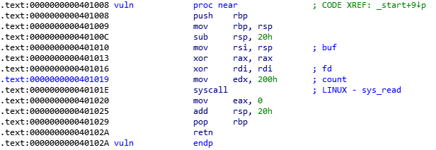 바이너리가 굉장히 심플합니다. nasm으로 구현된것 같네요. vuln함수를 보면 rsp에 입력을 받으니까 ret를 조작할 수 있습니다.
